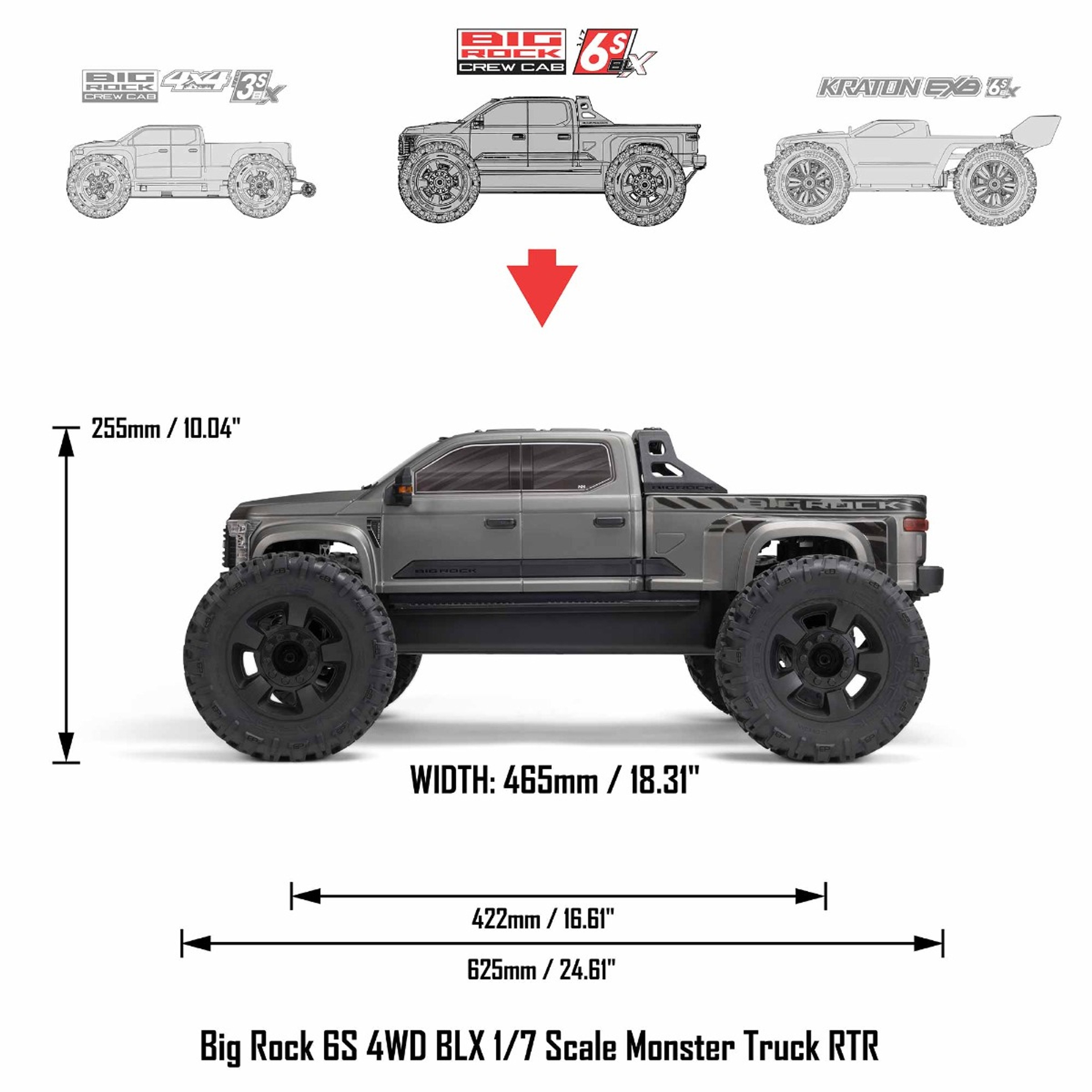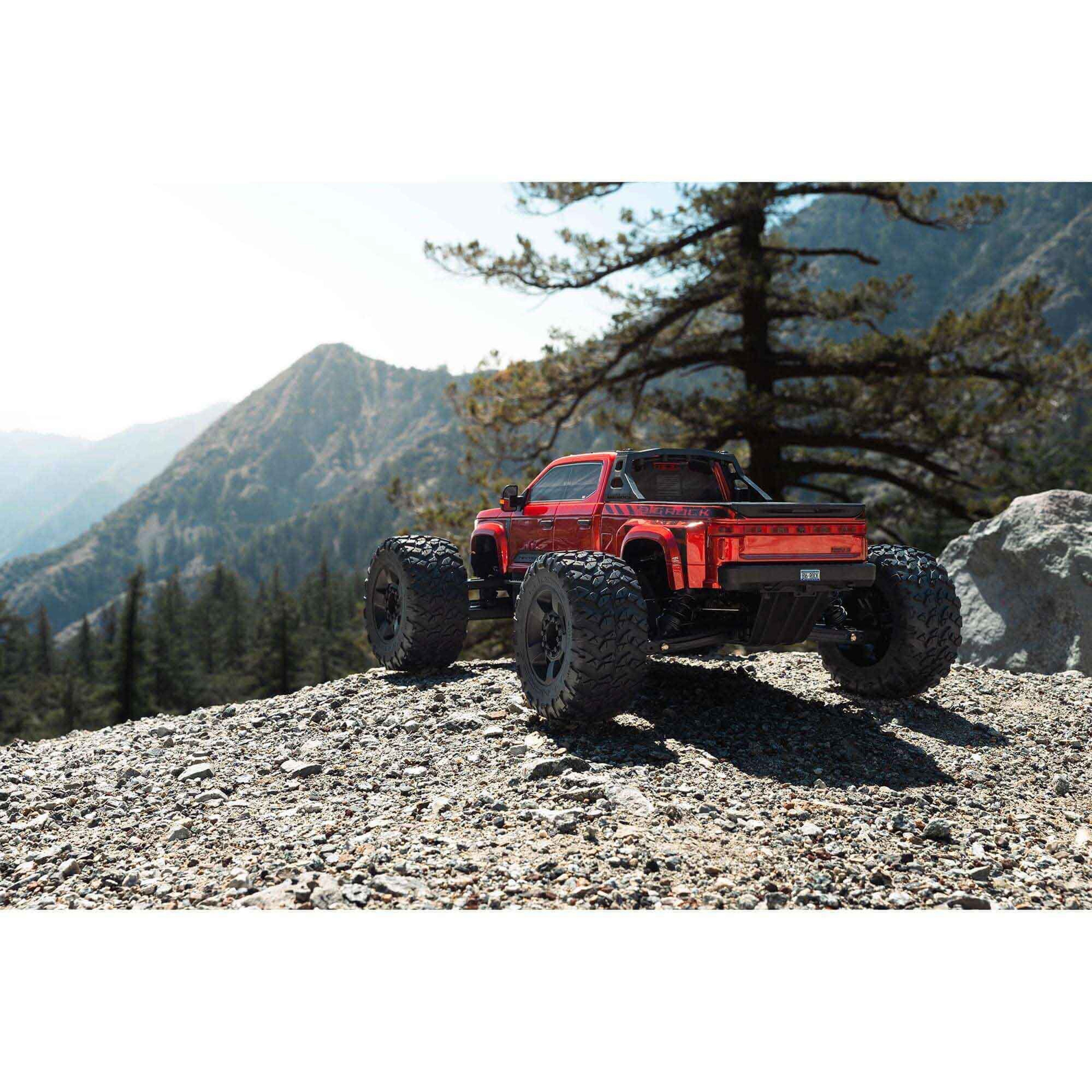 Supersized to 1/7 scale and amped up with 6S platform power, this BIG ROCK™ 4x4 blasts like only the big ones can! With ARRMA® durability and performance plus a detailed, rugged truck body, it's a massive, dirt-chucking monster capable of 65+ mph speeds.