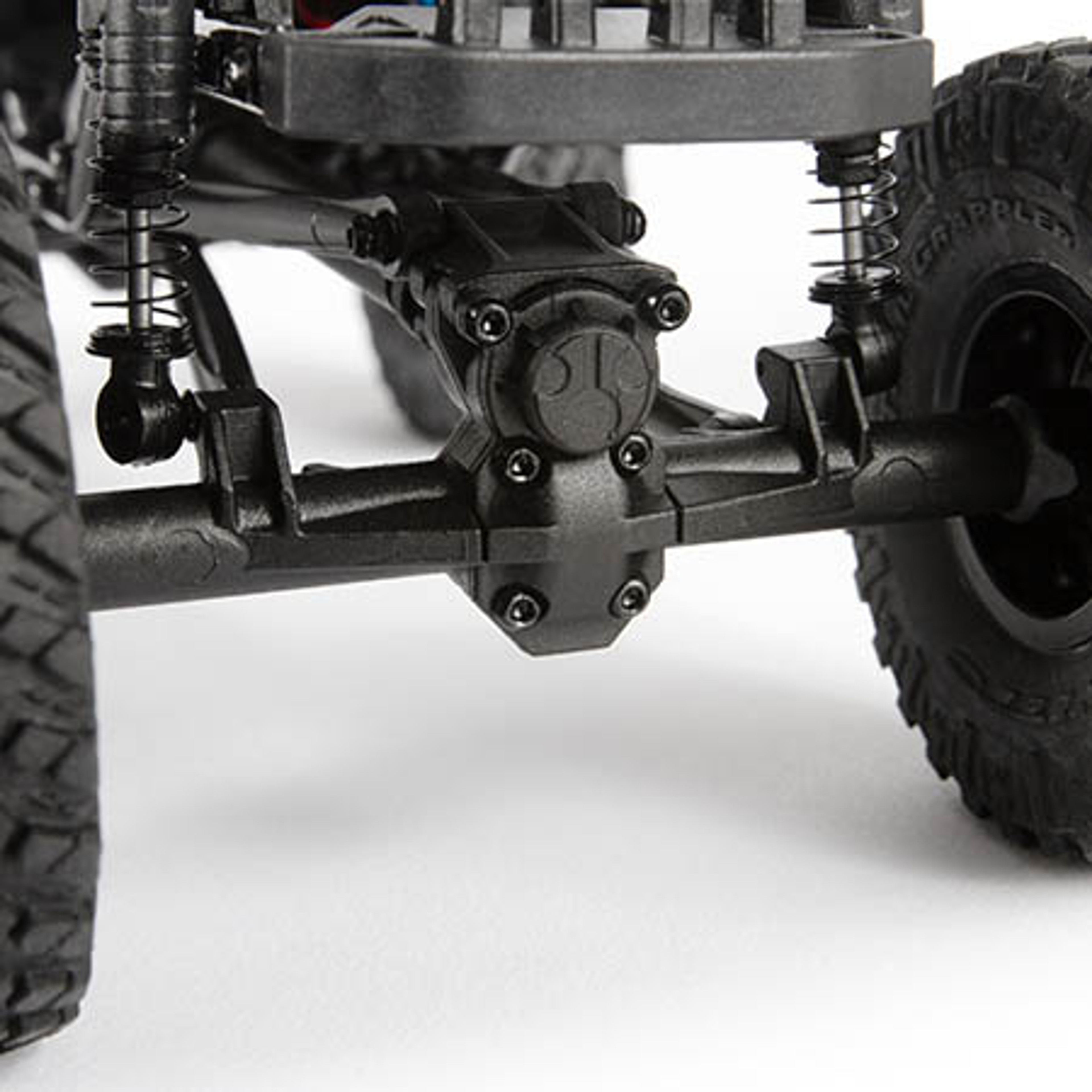 - Coilover shocks with simulated reservoir and durable plastic suspension links deliver proven Axial crawling performance