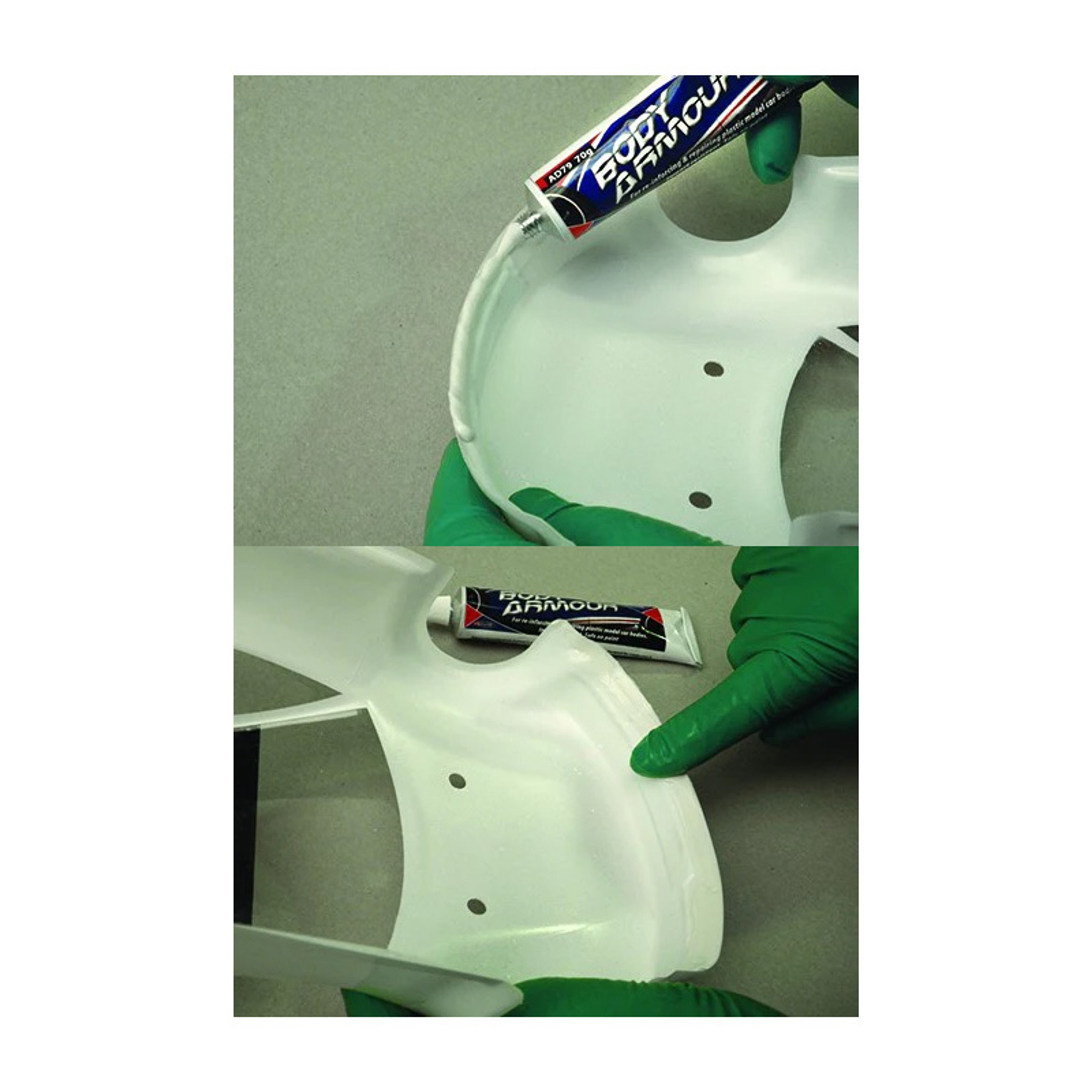 Deluxe Materials Body Armour is a highly flexible polymer adhesive specially designed for reinforcing & repairing model car bodies subject to the arduous conditions of model car driving and competition.