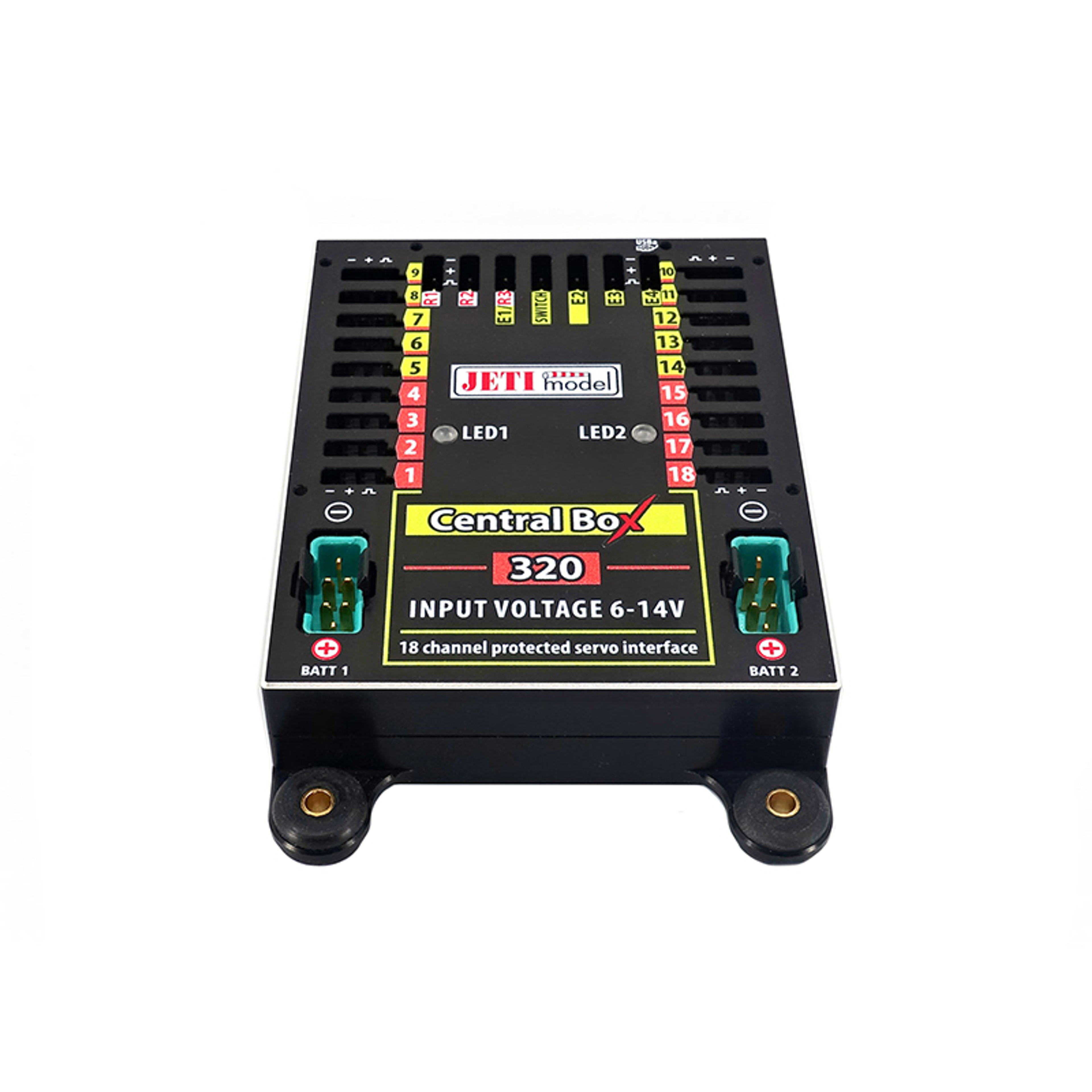 The Jeti Central Box 320 is a fully programmable switchboard with two (2) independent, stabilized power inputs with a single voltage regulator (20A Continues/80A Peak) designed for complete power and signal management of servos with great emphasis on safety.