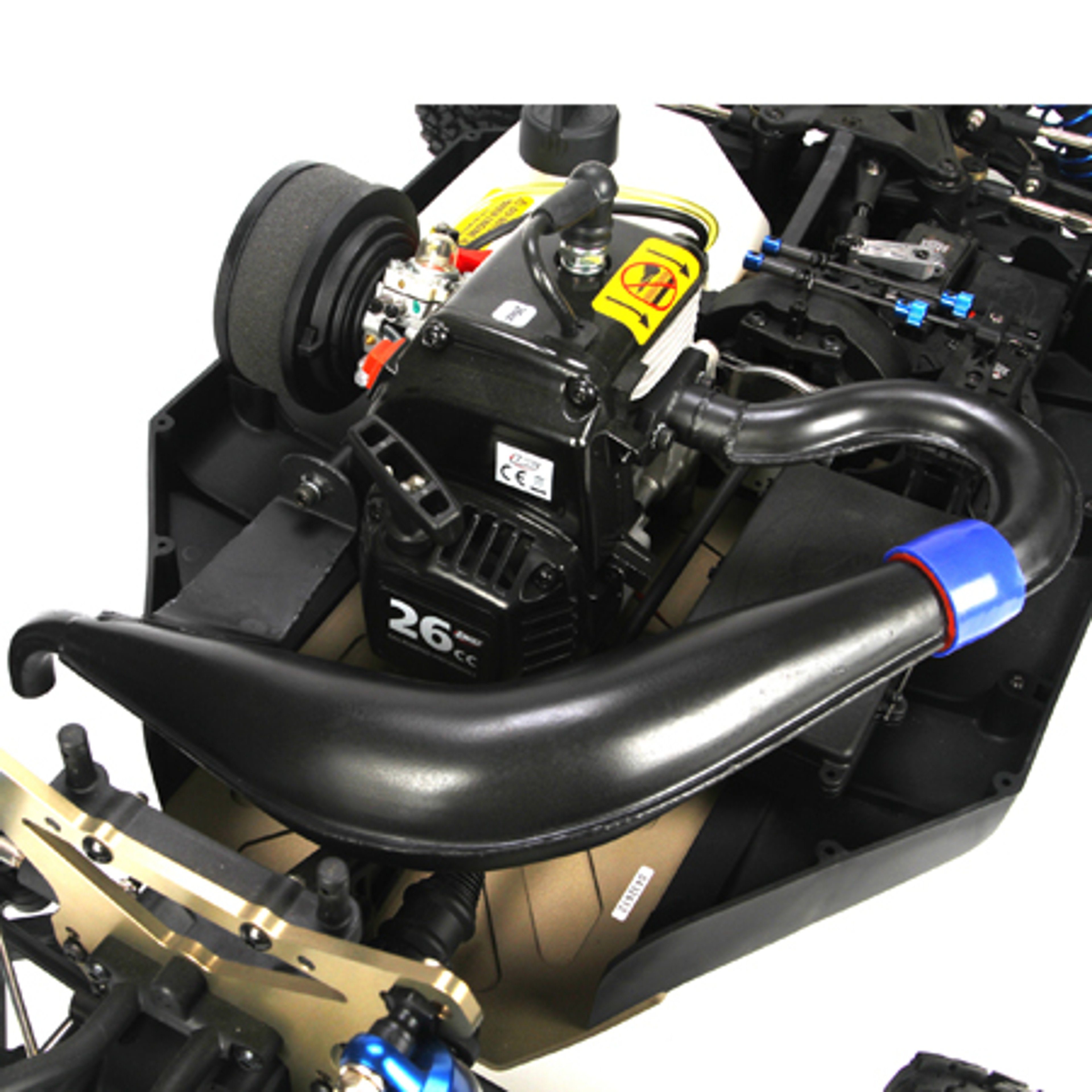 The Losi LOSR8020 tuned pipe is dollar-for-dollar the easiest and cheapest performance upgrade you can buy for your 5IVE-T. This complete exhaust system uses advanced two-stroke tuning technology to dramatically increase the low and mid range power and throttle response allowing any common 23-31cc engine to reach peak RPMs much quicker. The development was done over hundreds of laps and many hours by the Losi development team with the help of one the premier 1/5 scale engine/pipe builders. This design features a separate conical header and an ultra smooth tooled expansion chamber with a telescoping fit for both reliability as well as performance. The use of advanced precise tooling to produce both the header and the pipe optimizes the shock wave effect of the expansion chamber system as well as maximizing the durability. The hi-quality steel alloy is coated with a rust and heat resistant black finish for added protection and appearance. The compact design offers plenty of room for access to chassis parts and, since the pipe bolts directly and securely to the engine, gear changes and service on the clutch or engine is extremely easy. All mounting hardware, exhaust gasket and coupler are included as well as being available separately.