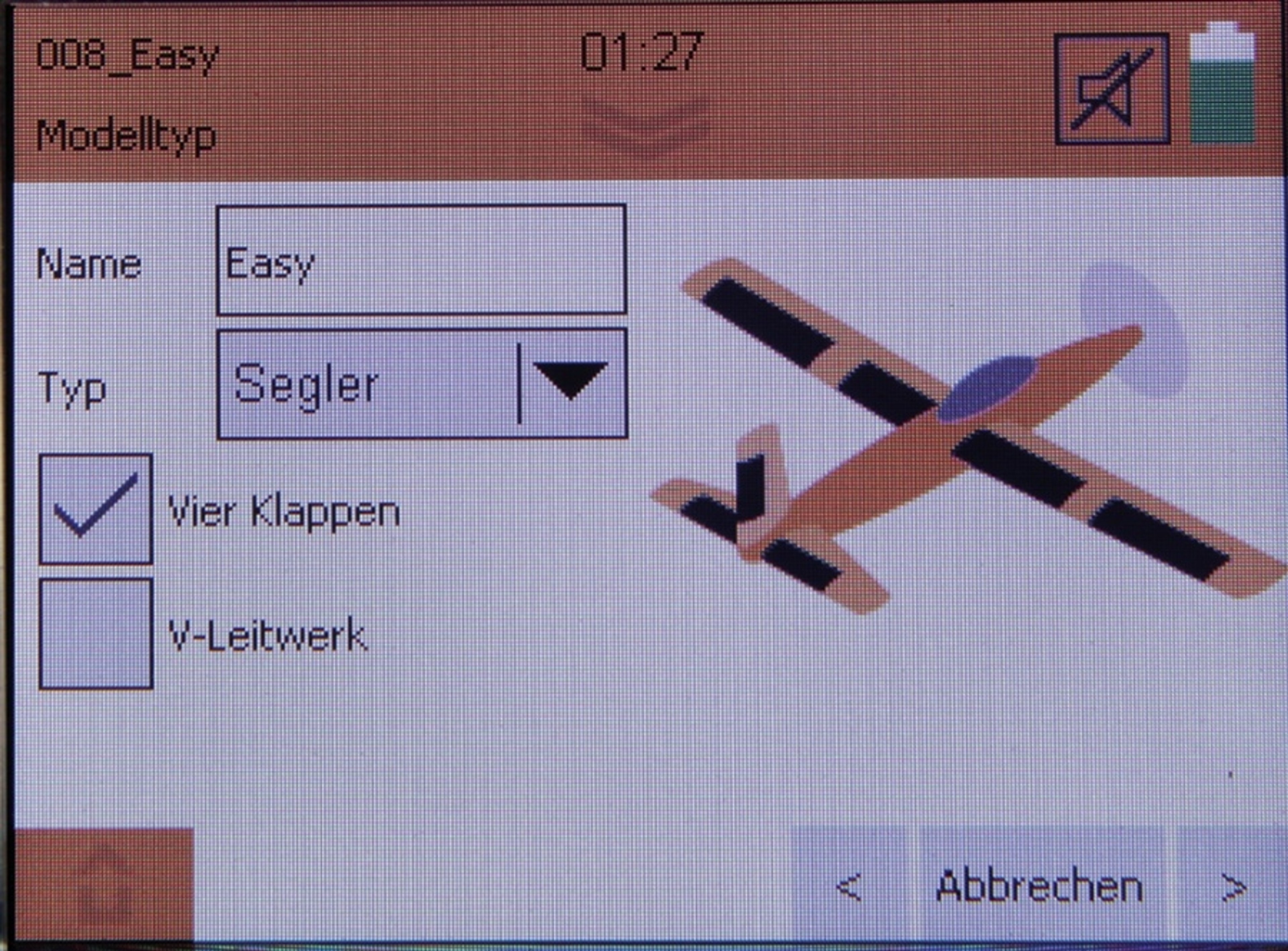 - Aileron differential, separately adjustable for each flight phase